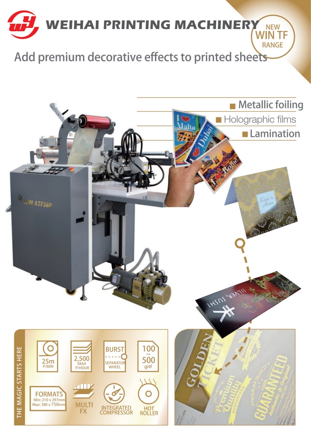 The 380mm Sheet-Fed Laminating and Foiling Press capax est automatice calidae figurae metallicae et coloratae sine catulis stampis traditis. Opportunum est non solum ad breves applicationes digitales postulandas, sed etiam ad schedularum lithographicarum traditionales rationes. Pelliculae holographicae utitur ad automatice punctis et aquatilibus exemplaria faciendis, cum materias typis etiam exquisitiores facit.