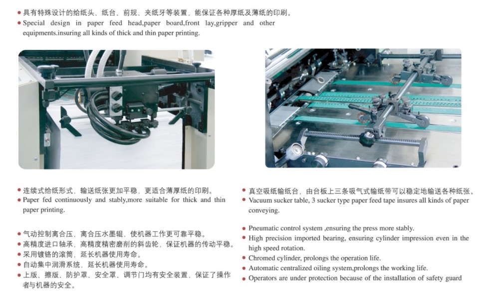 Cum venit ad A2 Four-Color Short-run Printing Offset Printing Press, aedificavit cum summus perficientur modulorum, qui illud certum faciunt, perfectum ad breves functiones excudendi. Hi moduli magni praecisiones scutellas et anniculos comprehendunt, robusta charta mechanismum pascens, charta certa ratio adnotationei, atramentum stabilis copia systematis. Negotiis mercati occurrit pro cut-sheeti colore imprimendi quod summus qualitas, efficax et sumptus-efficax est, praesertim pro brevibus jobs. Chartae crassitudines amplam tractare potest - ab 0.04mm charta tenui ad 0.4mm crassam chartam. Et cum eius tactus potestate et intuitive programmandi interface, facile potes acri adaptationes ad omnes ambitus et ambitus imprimendos.